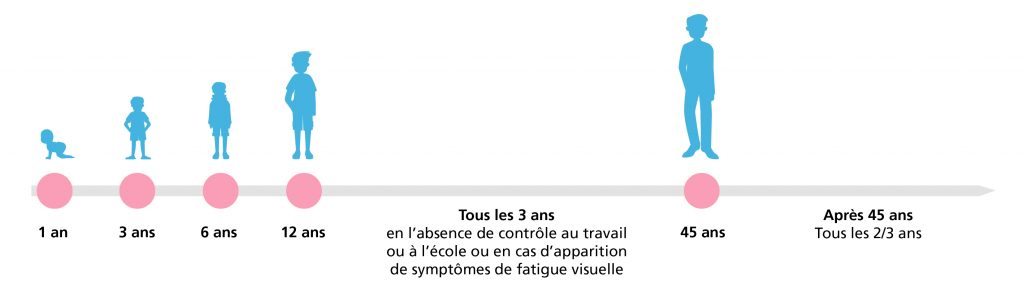 Même en absence de doute, il est recommandé de faire contrôler la vision de l’enfant par un ophtalmologiste avant son premier anniversaire et ne pas attendre son entrée au cours préparatoire pour ne pas prendre de risques et anticiper les problèmes de vue qui peuvent arriver dès le plus jeune âge. Puis, une visite à l’âge de 3 ans, 6 ans et 12 ans. Et en l’absence de contrôle à l’école, il est préconisé de faire une visite tous les ans.